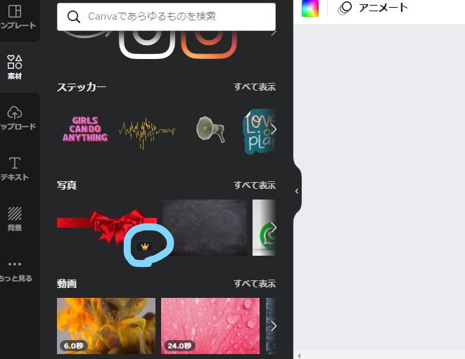 Canva無料プランの有料素材かどうかを判断するのは、王冠マーク(画像水色マークアップ)です。