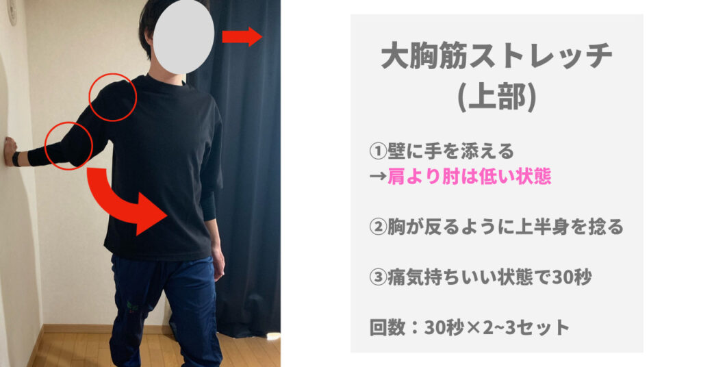大胸筋が伸びて、痛気持ちいい状態で30秒間、深呼吸をしながらじっとストレッチします。