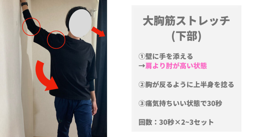 大胸筋の下部は、中部のストレッチと同じ手順で行います。