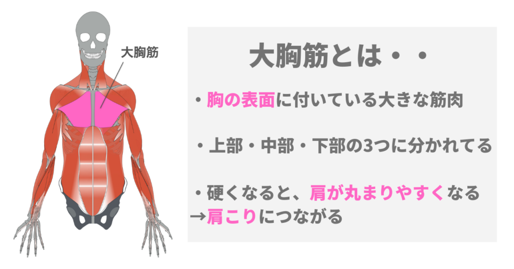 胸まわりの筋肉は硬くなりやすいので、こまめなケアが大切になります。