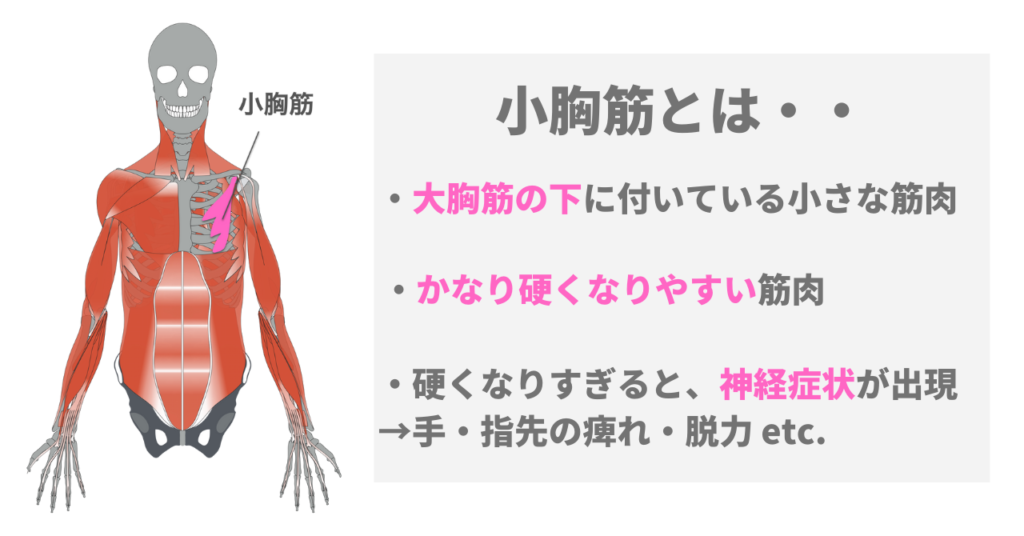 小胸筋は、大胸筋の下に位置する小さな筋肉で、非常に硬くなりやすいのが特徴です。
