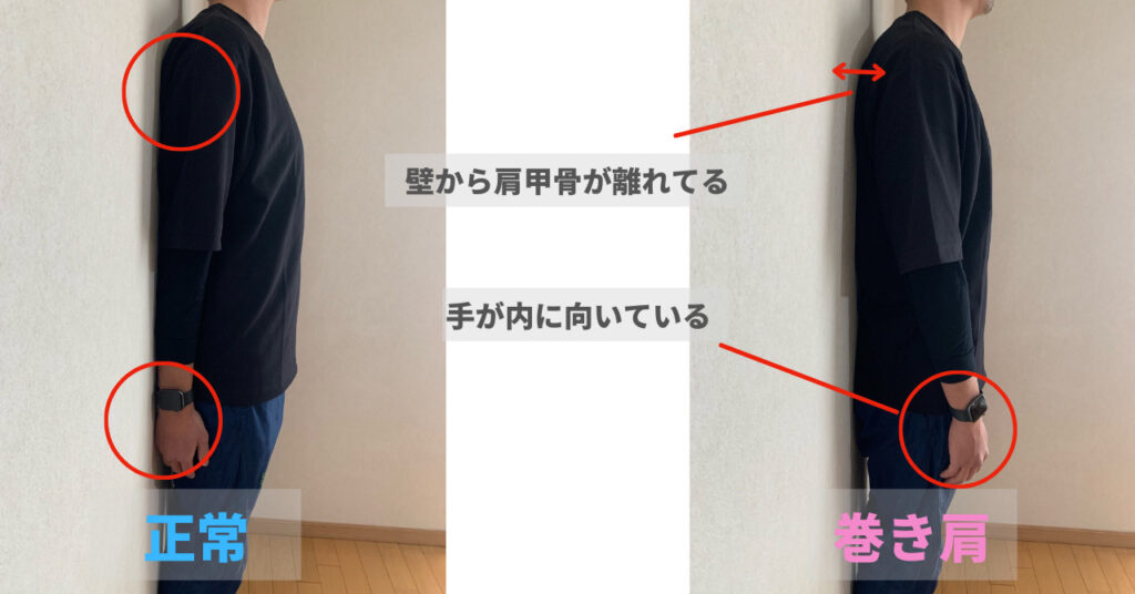肩甲骨が壁から離れたり、手のひらが内に向いていると、大胸筋や小胸筋が硬くなっている可能性が高いです。