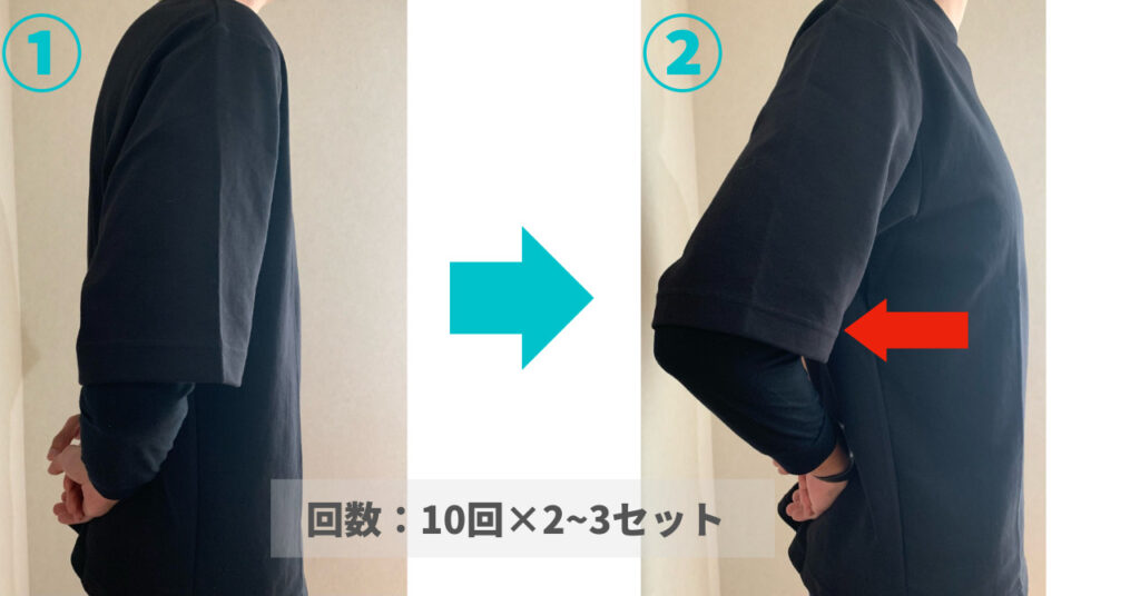 両手を腰あたりで組んだ状態で、両肘を後ろにゆっくり動かして胸を張ります。