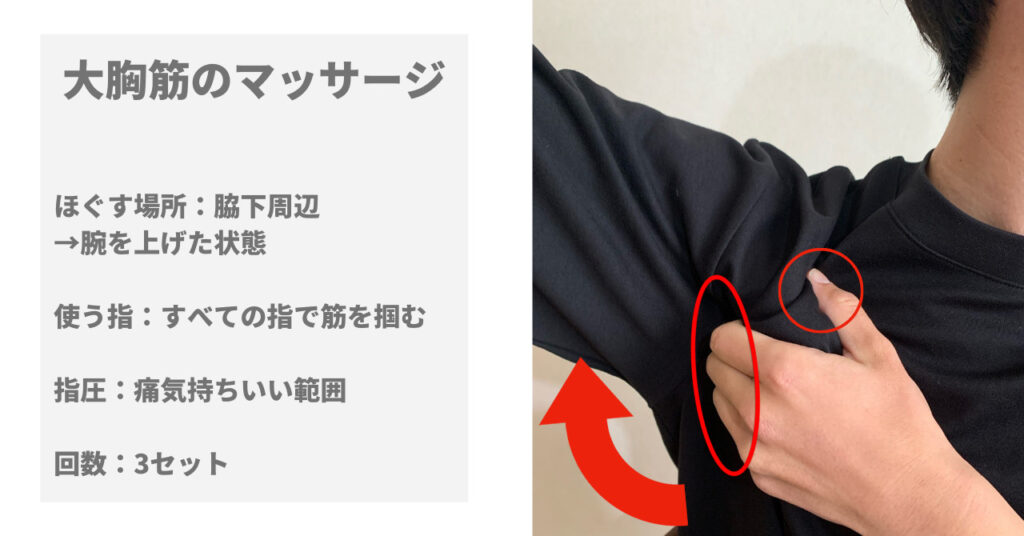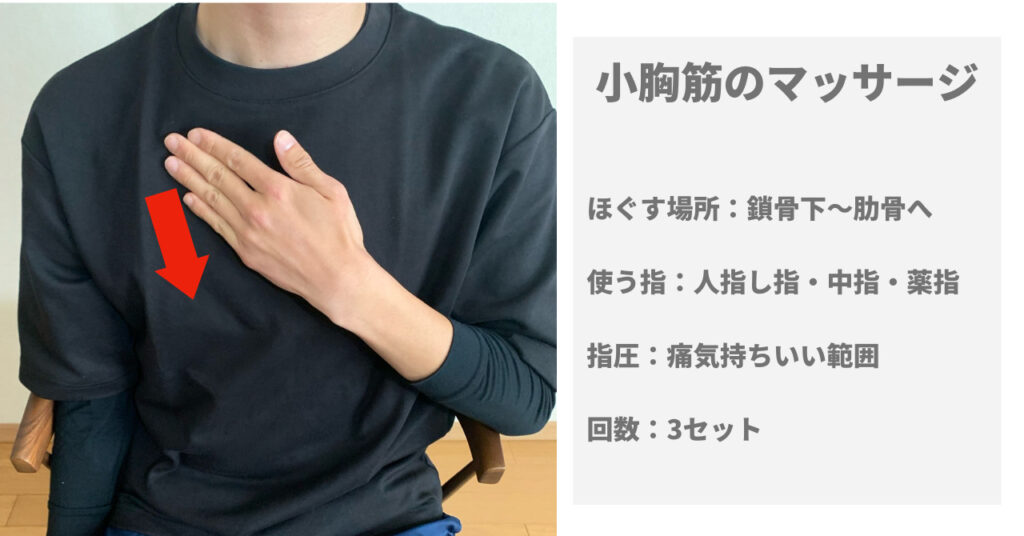 そのため、大胸筋の上から指圧して、小胸筋をほぐしていきます。