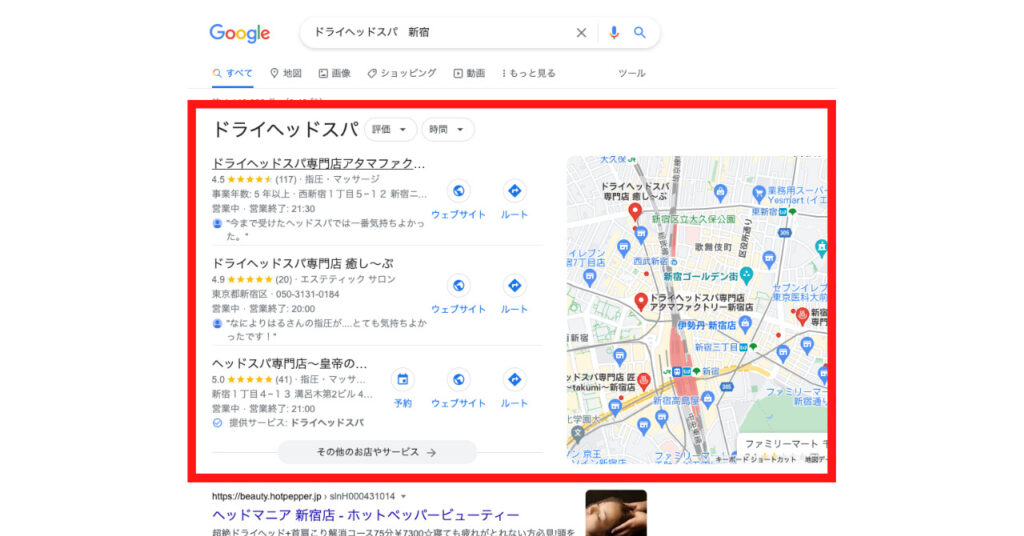 例えば、「ドライヘッドスパ 新宿」と検索すると、検索結果の上位にGoogle Mapが表示されます。